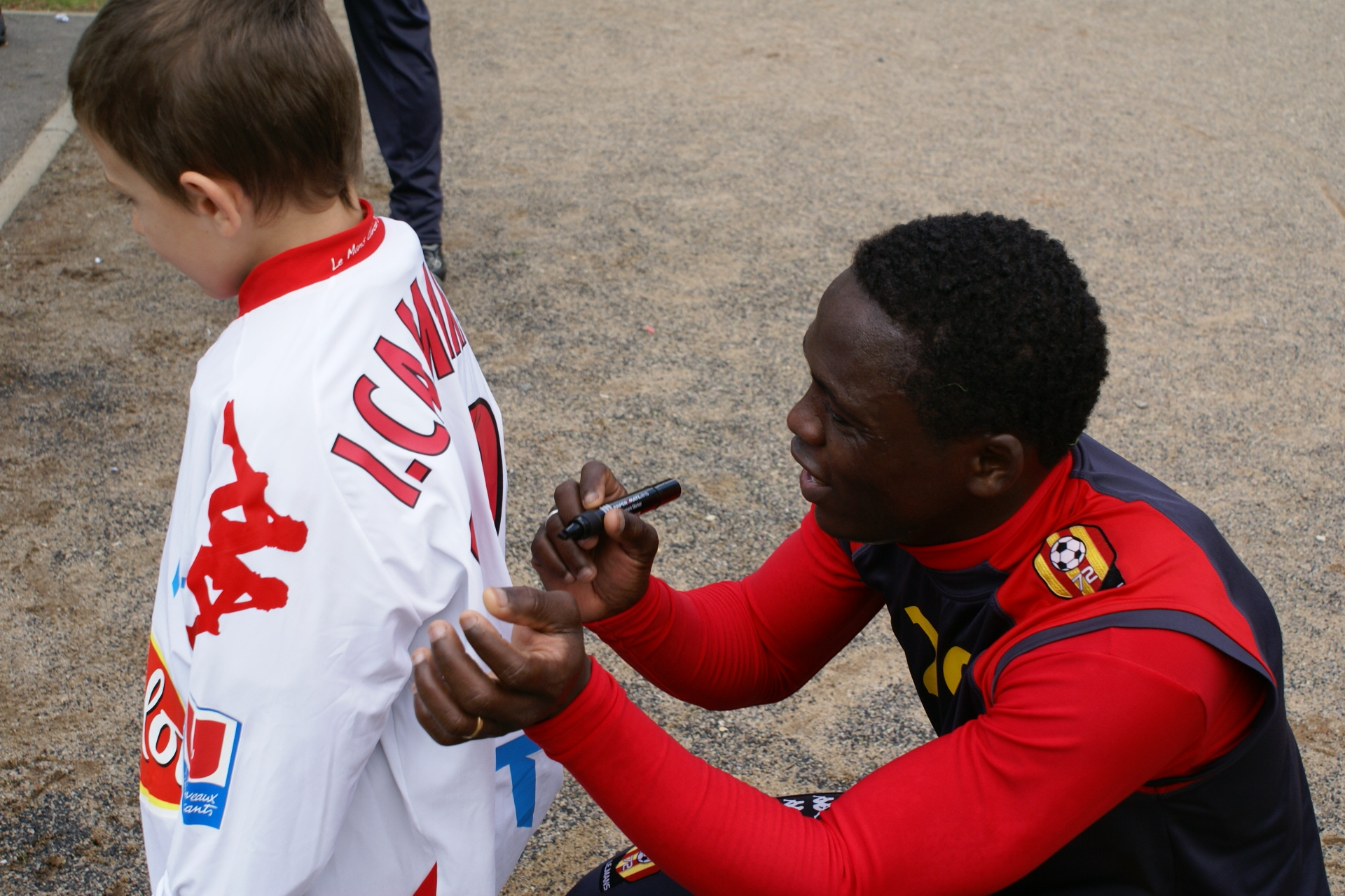 Pendant la signature du maillot sur le dos de mon fils